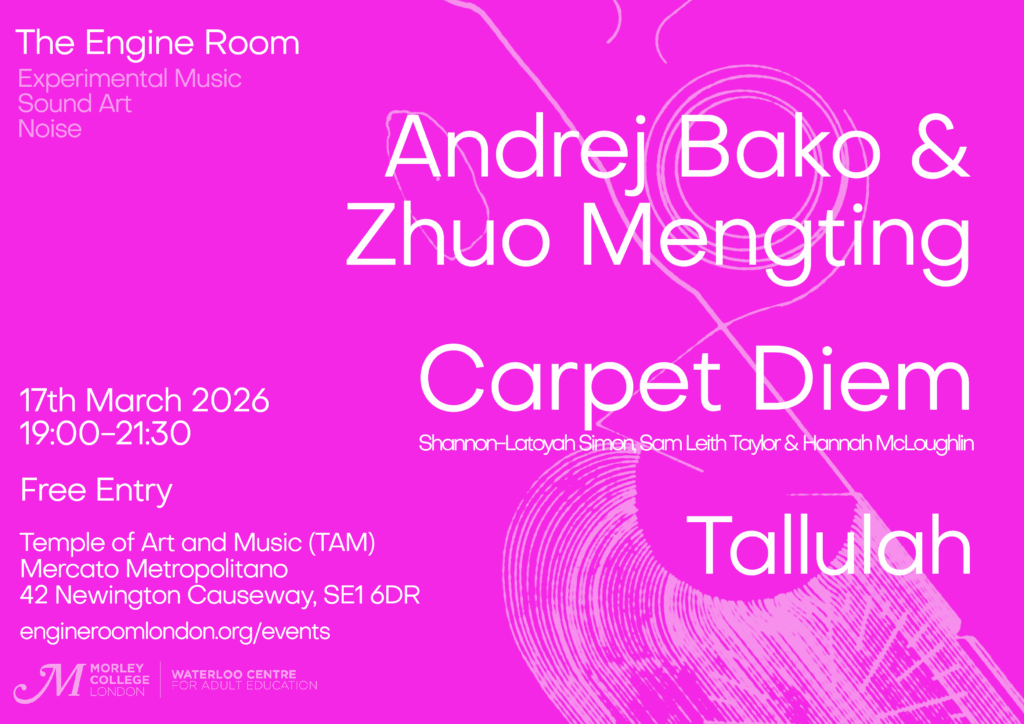 The Engine Room presents: Andrej Bako and Zhuo Mengting performing Sine, Surge; Carpet Diem (Shannon-Latoyah Simon, Sam Leith Taylor and Hannah McLoughlin); and Tallulah for an evening of sonic experimentation that pushes at the boundaries of sound art and music. Zhuo Mengting (b. Guangzhou, China, 1990) composes situations with site, sound, body and time, in […]